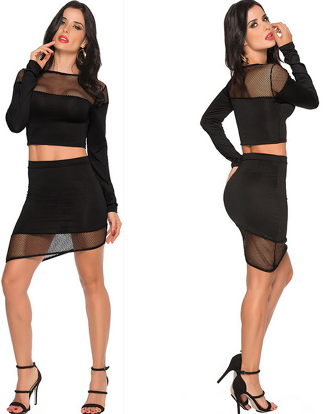 2pcs Black See Through Long Sleeve Club Skirt Suit