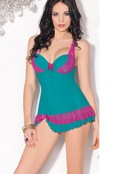 Get the show started in this blue stretch lace babydoll with front bow tie detail and the double ruffle lace hem with slit detail.