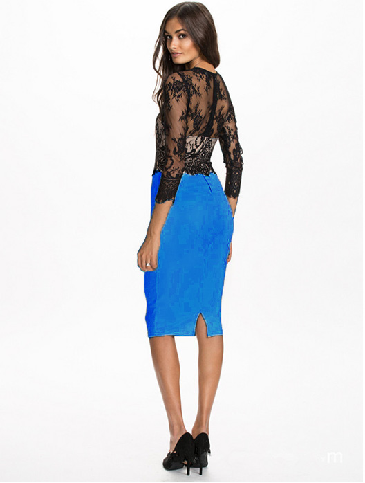 This sexy bodycon midi dress features tube dress and black lace overlay, hollow out stretch lace with floral print, 3/4 length sleeve. Small slit on the bottom, sweetheart neckline, zipper back and knee length.