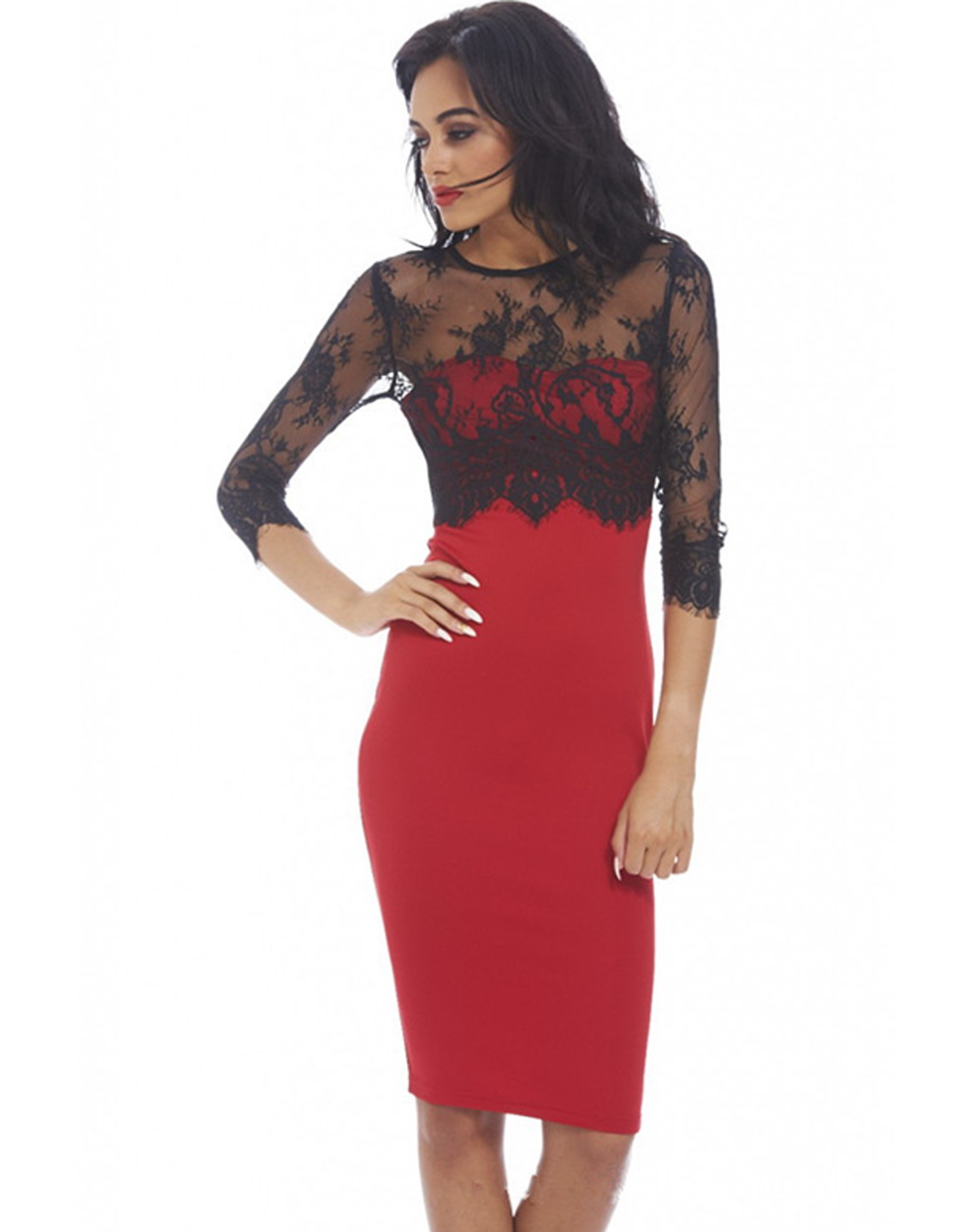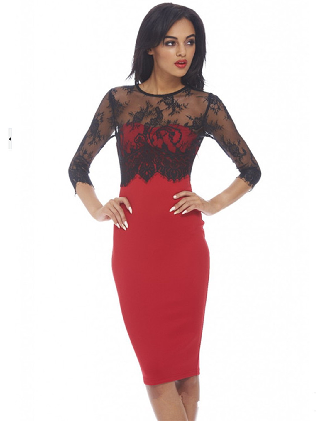 This sexy bodycon midi dress features tube dress and black lace overlay, hollow out stretch lace with floral print, 3/4 length sleeve. Small slit on the bottom, sweetheart neckline, zipper back and knee length.