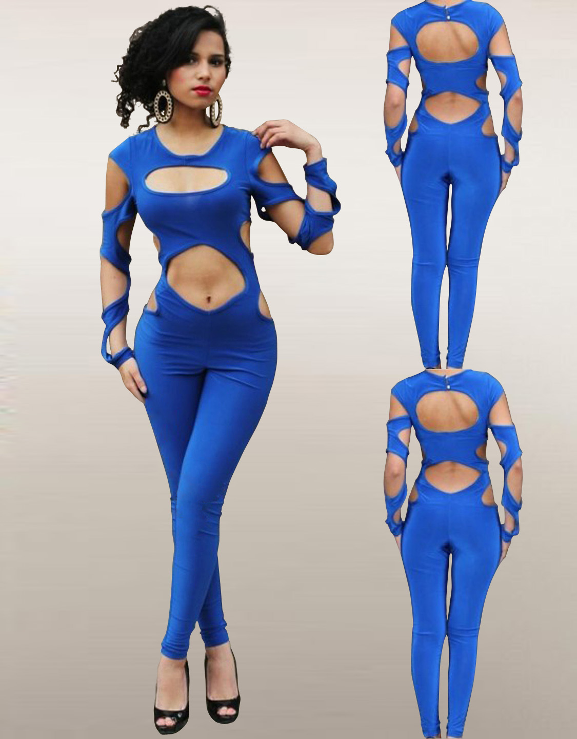 Blue Long Sleeve Cut-out Clubwear Jumpsuit