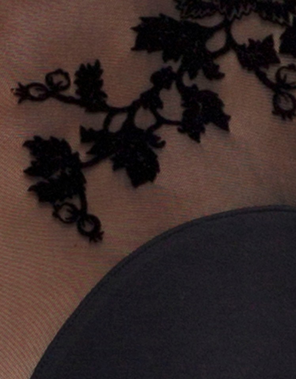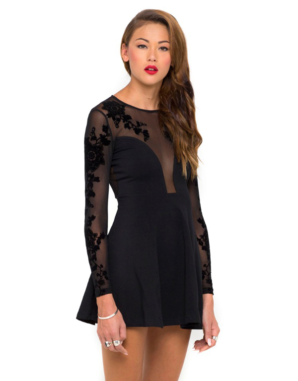 Black Long Sleeves Embroidered Mesh Plunge Hollow Out Back Skater Dress