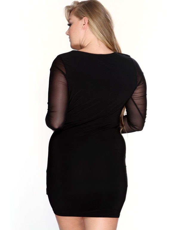 This black mesh full sleeve red panel club plus size dress features soft touch fabric, sheer mesh stitching of full sleeve and round neck, front red panel accent, above the knee length.