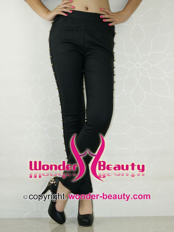 Wonder Beauty Leggings Store.Black Metallic Luster Rivet Leggings are distinctive for its bead ornament at the seam side of the trouser.These simple but stylish designs are easy to match with your all top in your wardrobe this season.Wearing your favourite pumps can highlight your figure.Superior elasticity keep you soft all day long.As leggings are in vogue these years,every woman should have at least one matchless leggings to show your beautiful long legs.So visit our website to update your wardrobe.
