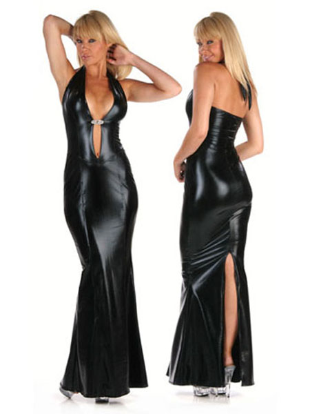 Black Sexy Low Cut Metal Furcal Long Dress is crafted with low cut design that can show your plump figure to the perfection.And this leather-like fabric make this dress uncommon.Match with your high-heel shoes to highlight your figure.Whar's more,the furcal cut can show your devil curves perfectly.