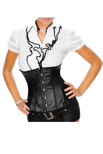 Vegan leather strapless corset with front busk closure, lace-up back for cinching and matching thong. Top not include.