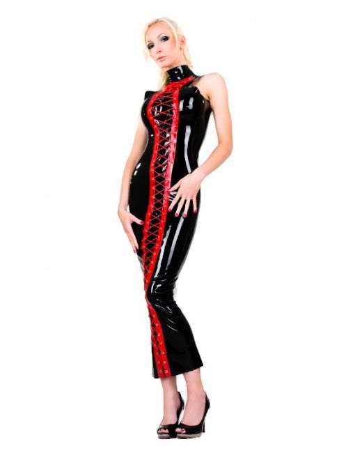 Black Wetlook Leather Long Tight Dress. Sleeveless long leather dress. Red ribbon cross whole custome.Cross strappy in front costume.