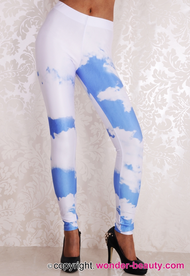Start your day in these awesome leggingd with a blue sky and white cloud print. Stretch fabric.