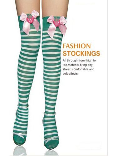 Blue White Stripe Thigh Highs With Plush Strawberry Satin Bow Top are distinctive for its cute green white stripe pattern and pink bowknot above the knee.These lovely stockings are for those cute girls who want have vibrant style.Match with your sassy skirt to build your fashion style.If you want to show your figure to the perfection,corsets may help you.We have many kinds of corsets to fit your figureso don't hesitate to visit our website .We are looking forward to your order.In addition you may be interested in our Wholesale Sexy Lingerie.