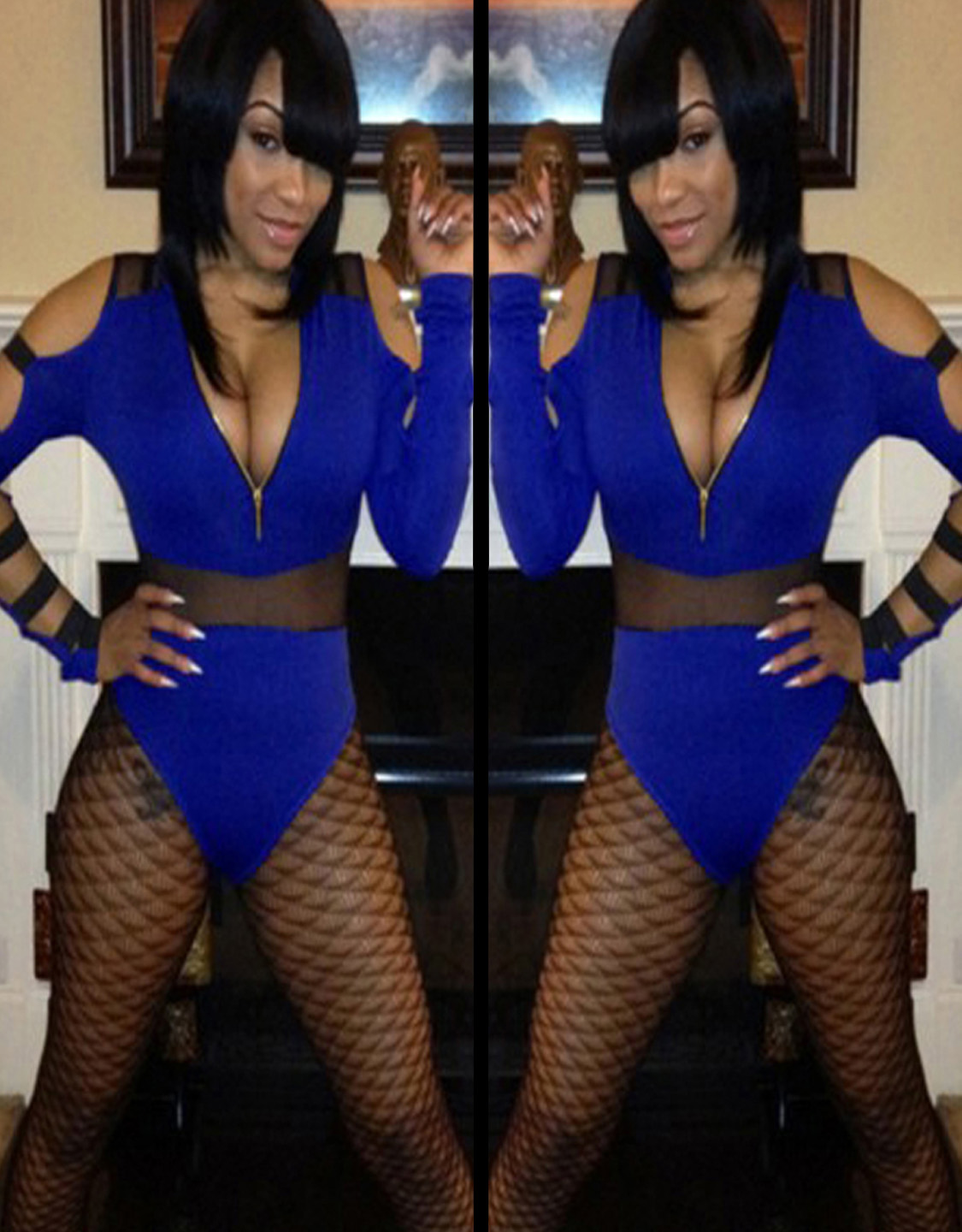 Cut Out Sleeve Front Zipper Mesh Inserted Sexy Women Bodysuit Blue