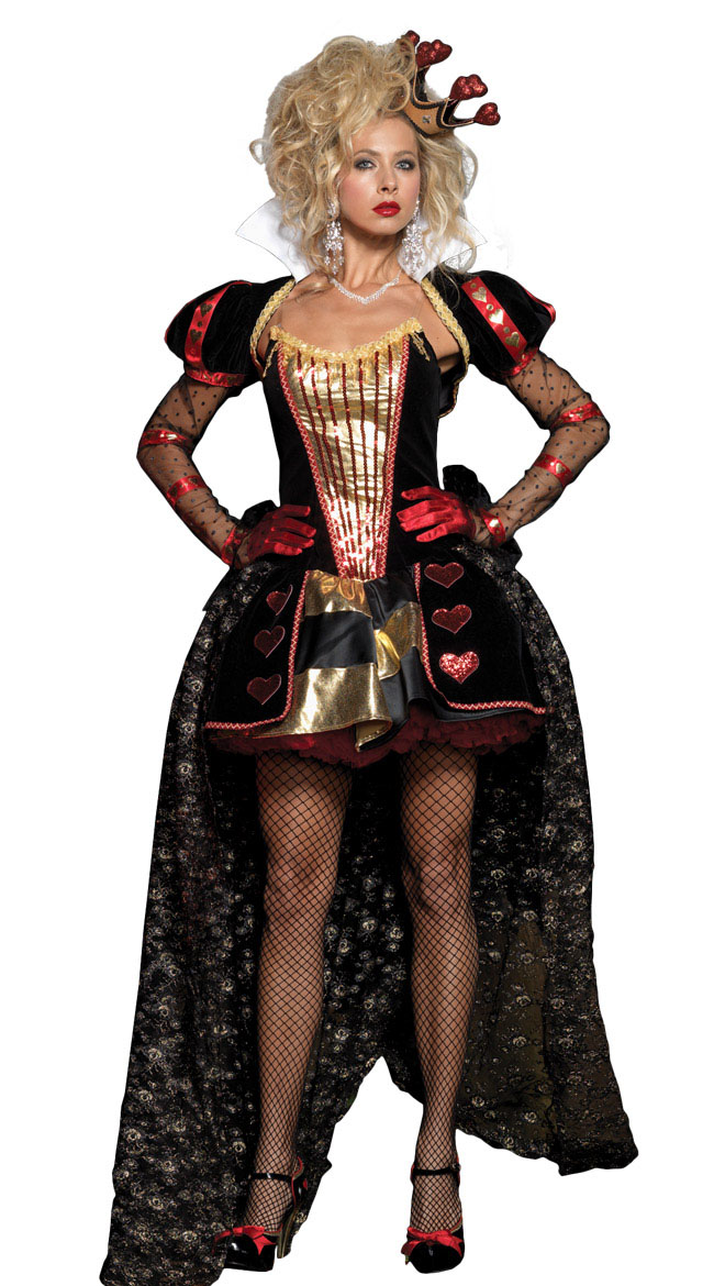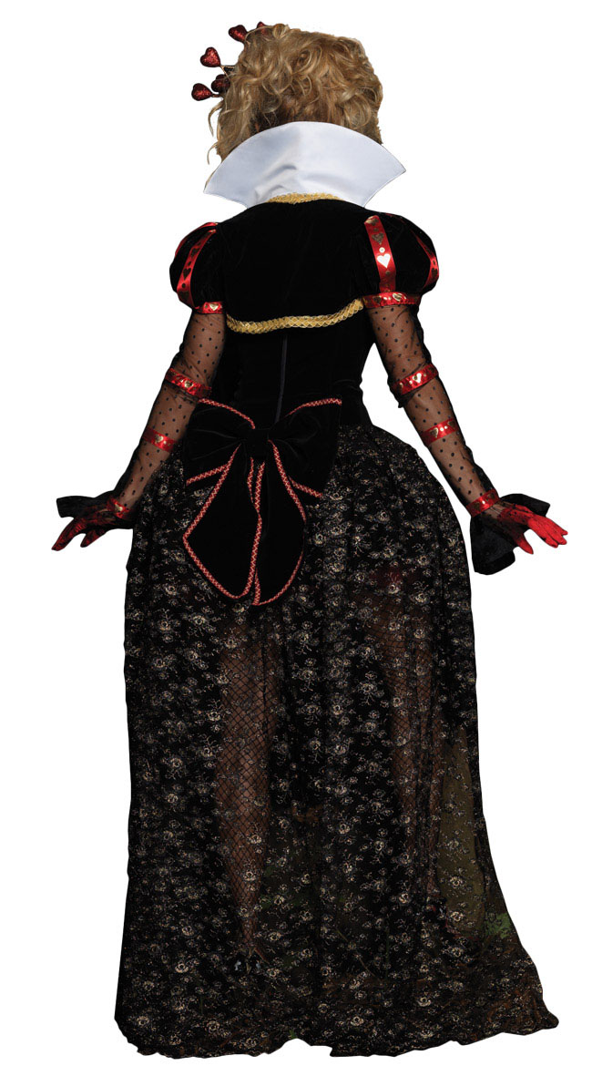 The four-piece, Deluxe Wonderland Queen costume includes a sequin trimmed, velvet and gold lame dress with clear straps, silhouette boning, layered, checkerboard print mini skirt with floor length, lace train, ribbon trimmed shrug with puff shoulders, lace sleeves and attached stay-up collar, oversized back bow with contrast metallic trim and matching crown headpiece銆 Gloves,petticoat .