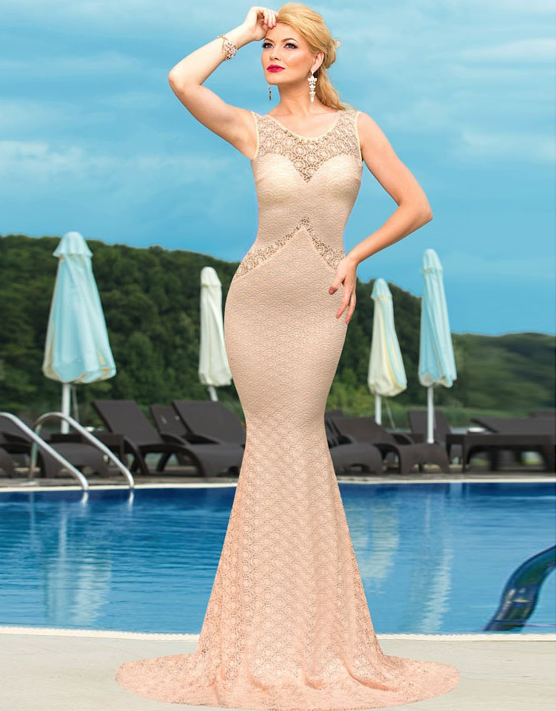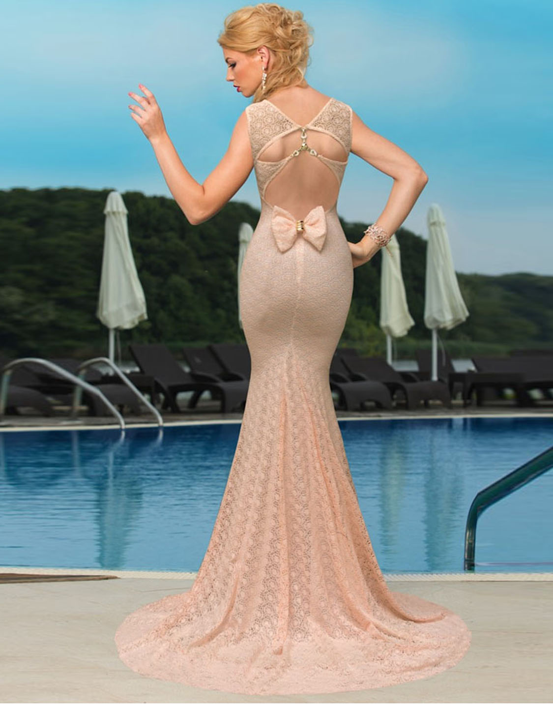 The vintage long dress mermaid style is perfect for many occasions. You can be easily the attention of the crowd. Panel shoulder strip, scoop neck, cut back and bow applied to the back, closure with hook in unique design. This dress features with symmetrical beauty.