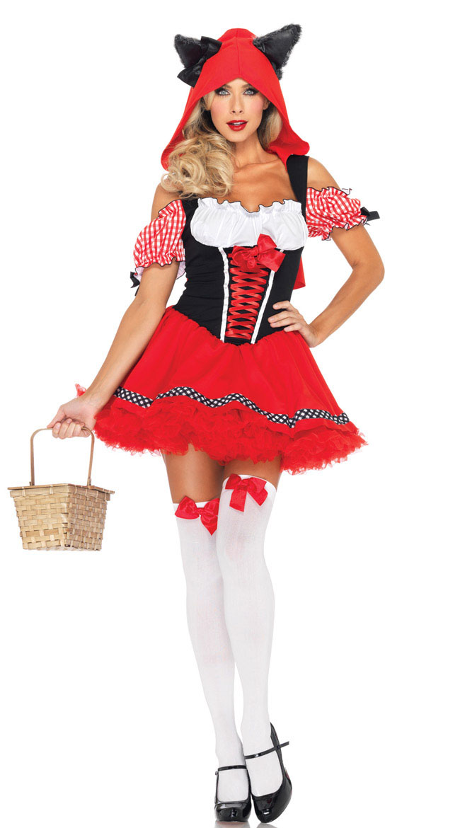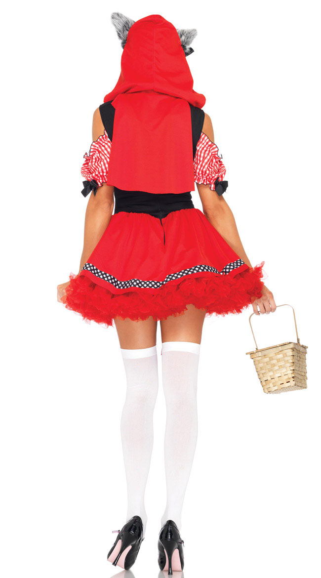 Fantasy Red Riding Wolf Costume.The Red Riding Wolf costume includes a gingham-trimmed peasant dress with puff neckline trimed detail attached black lace ribbon coat and a wolf hood. Shoes, petticoat, and stockings not included.