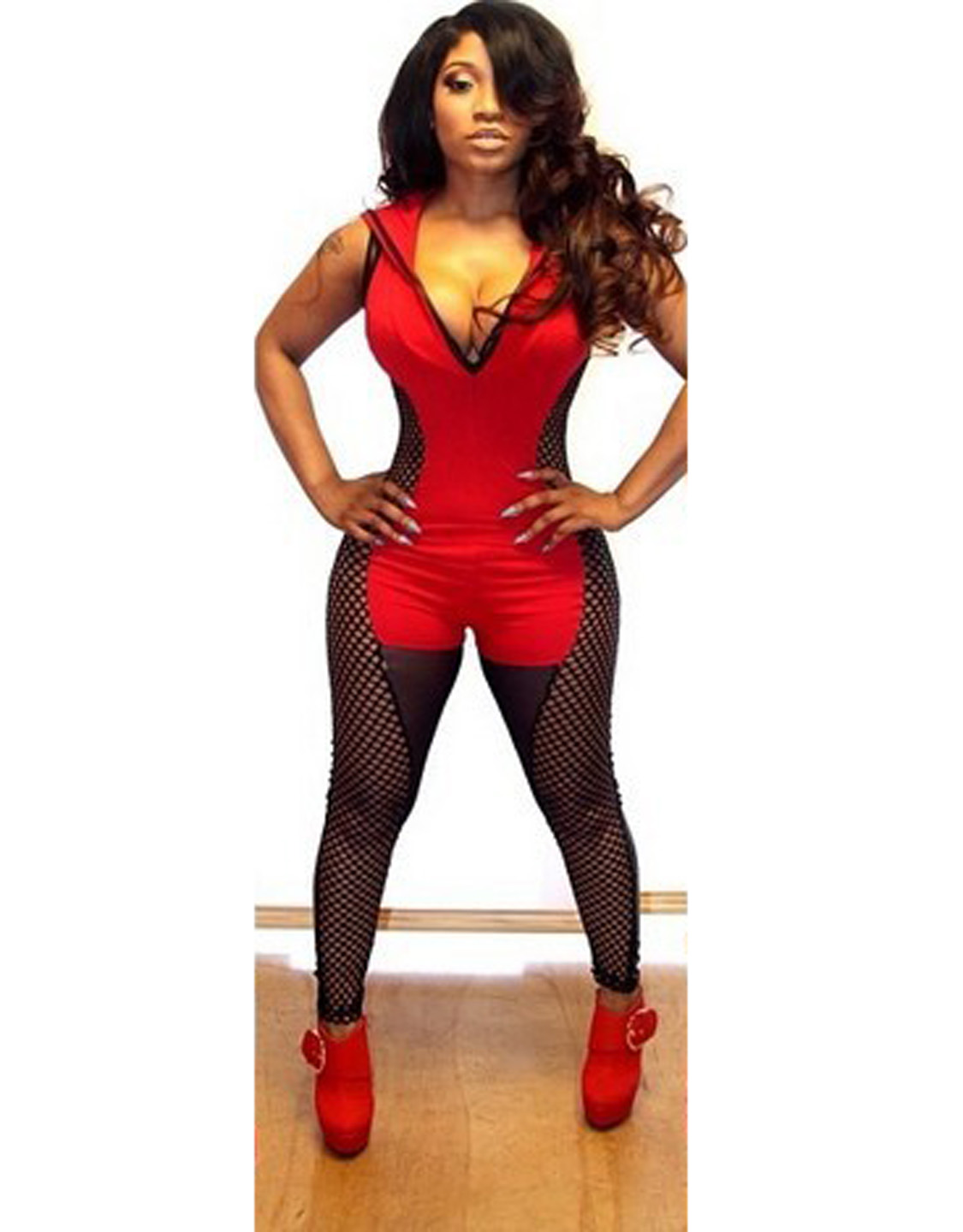 Faux Leather Mesh Matching Hooded Deep-V Neck Sexy Women Jumsuits Red