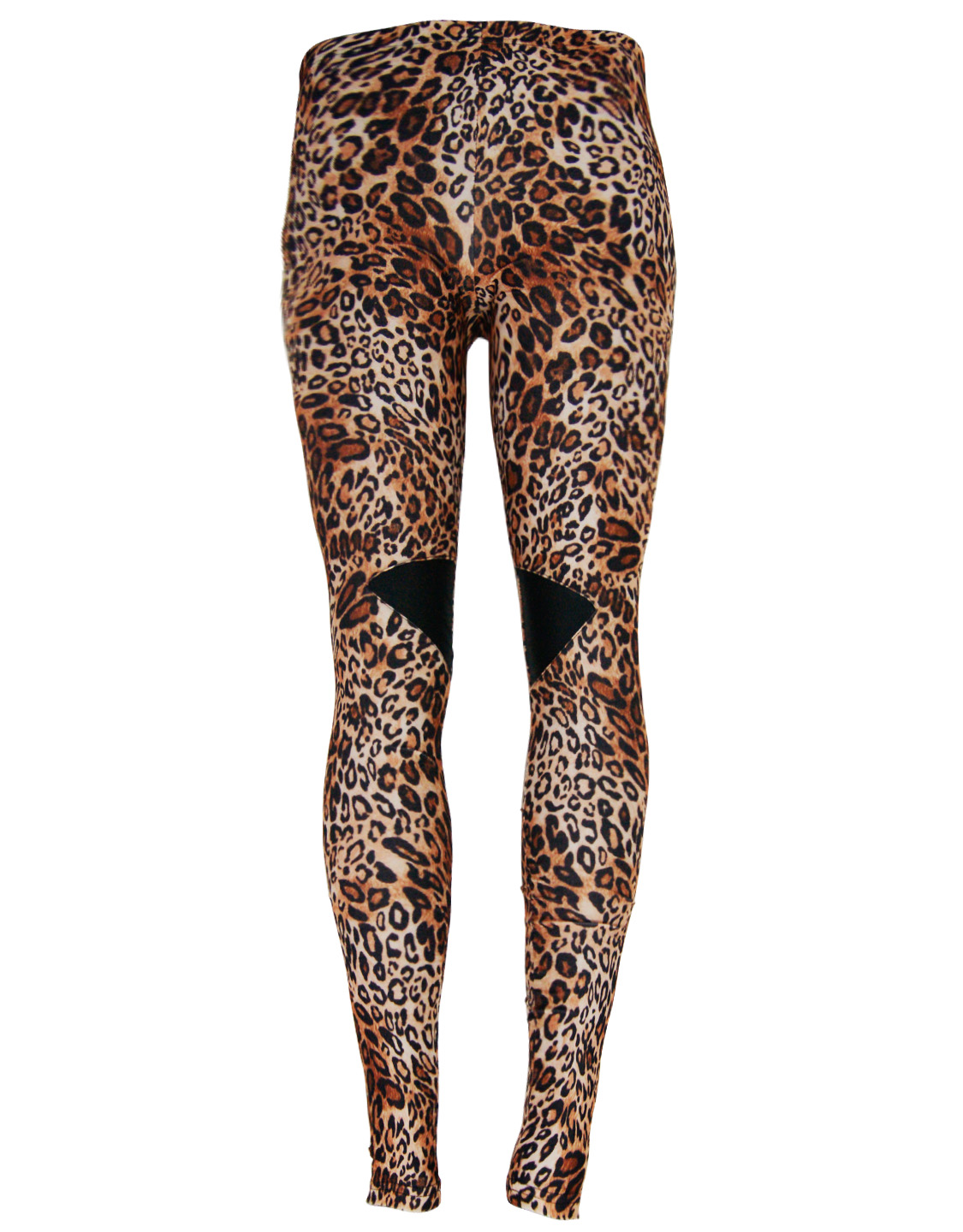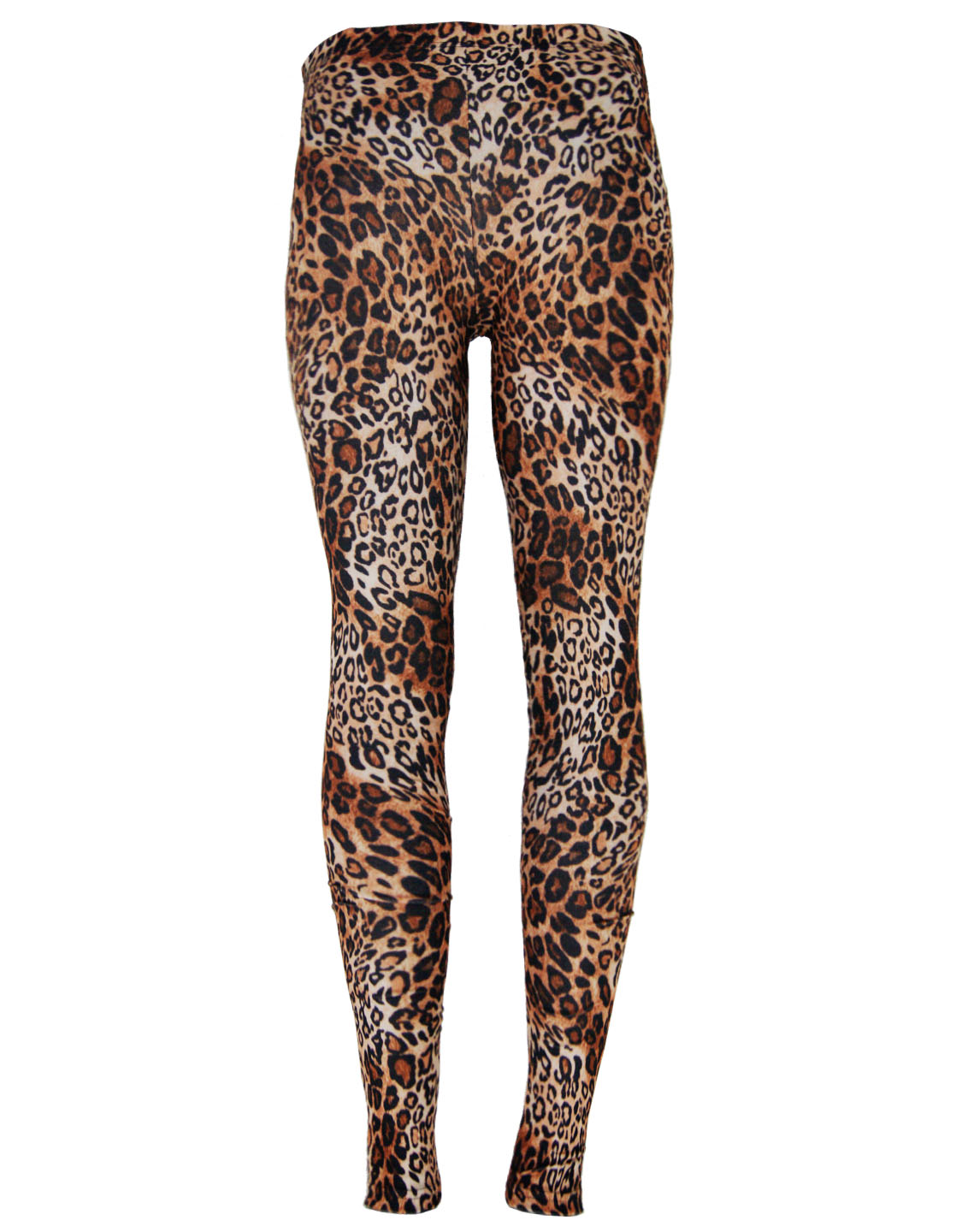 Smooth and soft leggings constructed from polyester featuring an elastic waistband and leopard print designs.