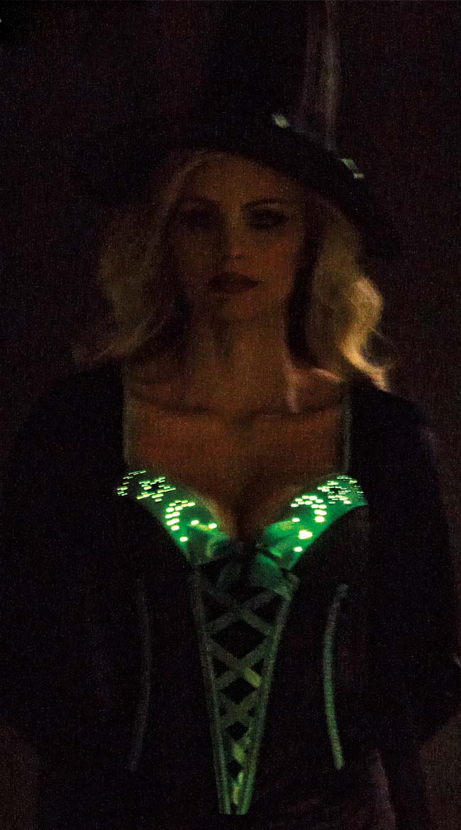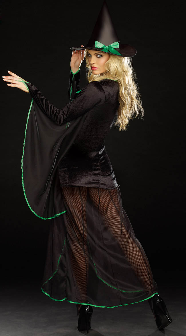 The Light-Up Witch Halloween Costume is a three piece sets includes a sexy black v-neck corset top with lace-up ribbon front,flower neckline trim detail,attache a fold skirt and long lace ribbon petticoat,a matching witch hat.Need stockings independent sales.Fabric:Polyester/Spandex