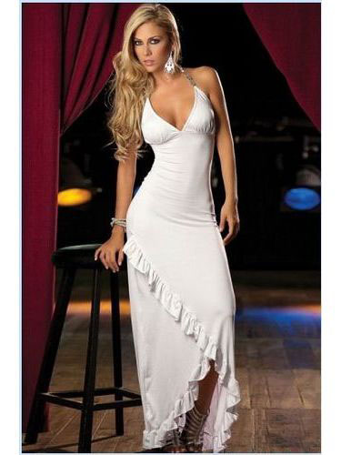 Long, ruffle trim gown with cross over front, open back, low cut front, halter top and metallic strap detail. The ruffle hem looks extremely graceful and glam. Fully lined and quick dry.