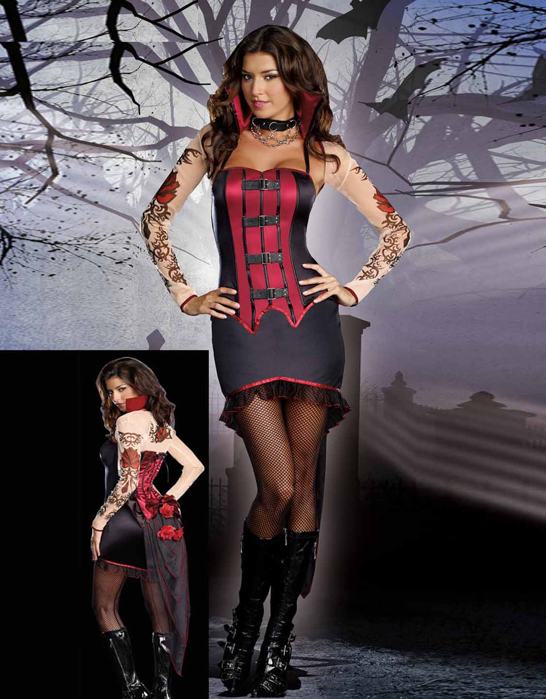 This sexy Halloween costumes includes the corset style top with long sleeve tradition print detailing, matching a high red stand collar with big bow long-tail hem. Pair this up with any of our vampire sexy costumes for a sexy and sleek look!