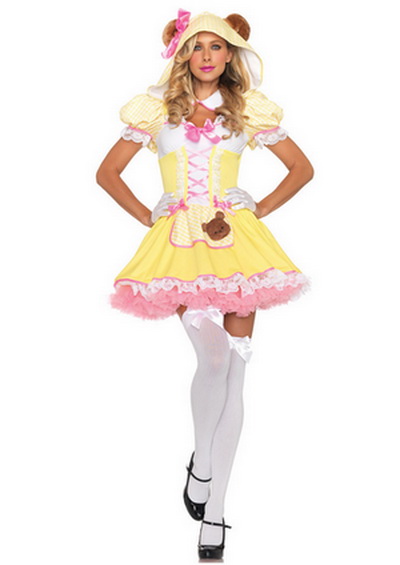 Wholesale Costumes.The Mistletoe Sweetheart Dress includes a faint yellow corset top with lace ribbon and buttrefly on front attached puff sleeves trimed detail,attached apron with candy cane applique and a matching hats.Stocking not included.