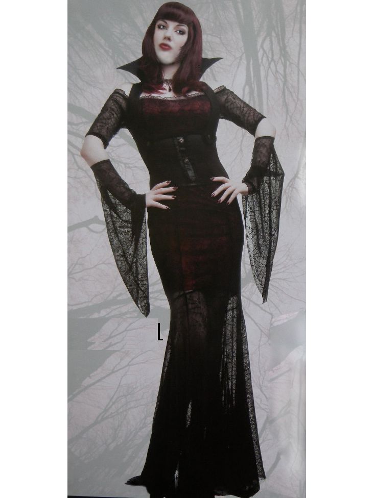 This Mysterious Mistress Costume features a long sleeved crushed velevt gown with cut out heart keyhole neck detail, centre front ruched bodice and spider web shimmer chiffon zig zag trim along the cuffs and hemline.