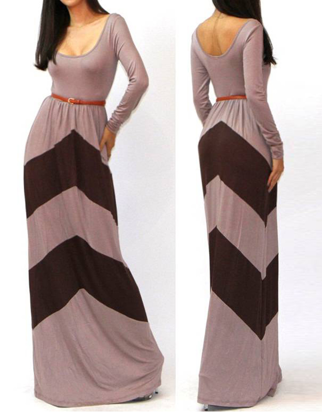 O-Neck Long Sleeves Grey And Black Stripes Floor-Length Long Gown Dress