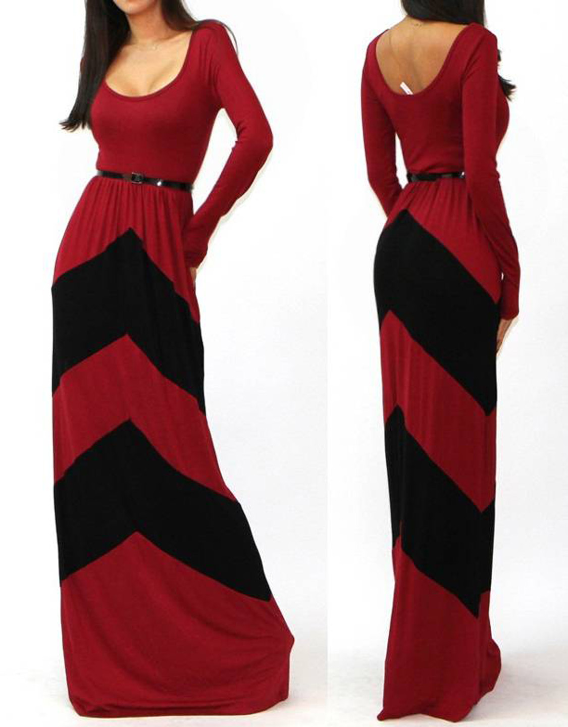 O-Neck Long Sleeves Red And Black Stripes Floor-Length Long Gown Dress