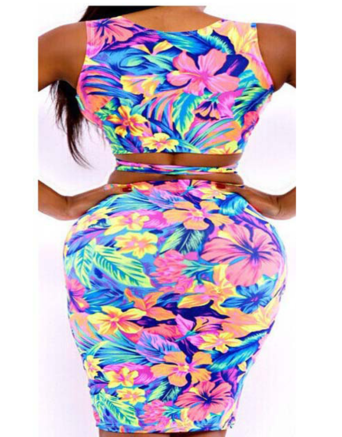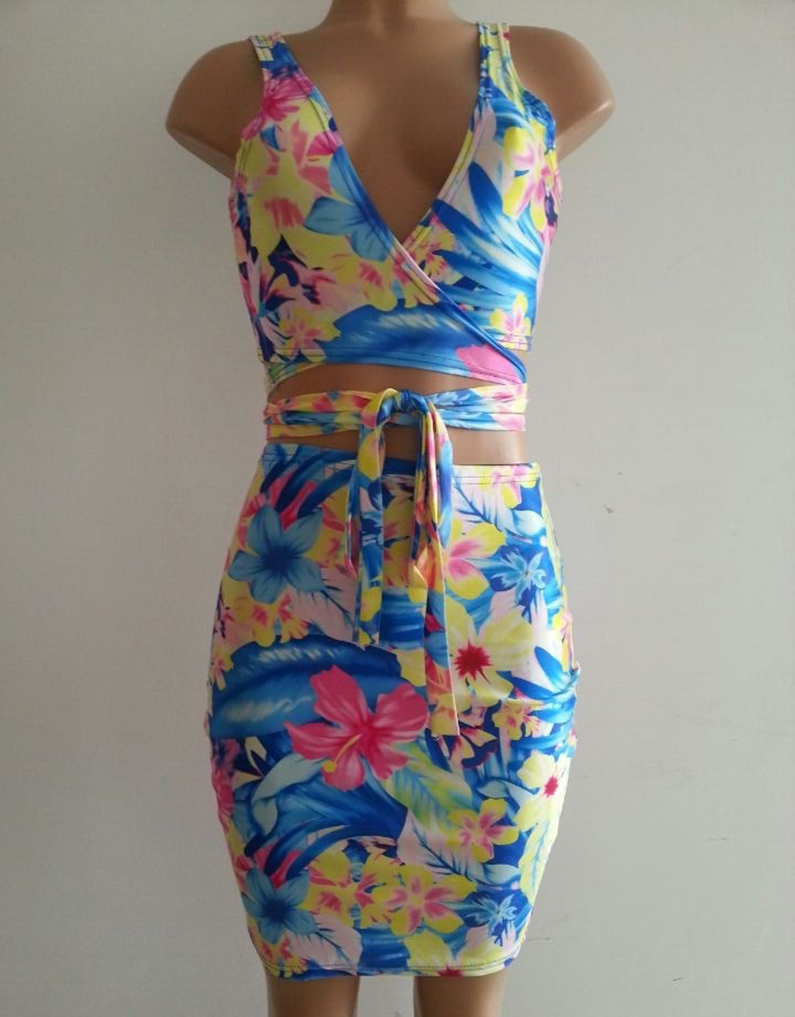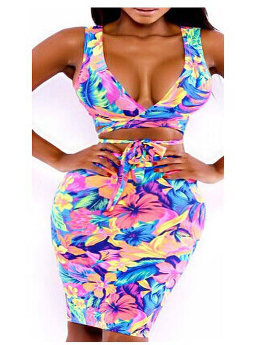 It’s definitely essential this summer for any girl’s wardrobe! It features shimmery oil painting shell, wide v neck, unique strap tie top in sleeveless design and and a midi length curve-hugging skirt.