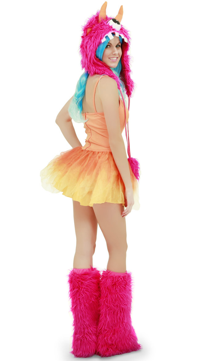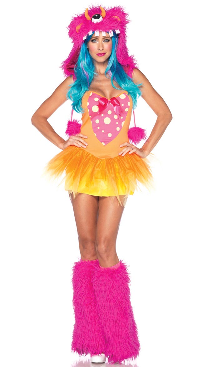 Seize all attentions and wow people by Pink Gold Shaggy Shelly Monster Costume.3 PCS costumes includes a strapless gold corset top with a big heart print front,attache a lace tutu skirt,built-in a petticoat,a leg warmers and a matching monster hat.Don't forget to buy some jewelry,it will make you look a magic effect. Wholesale Costumes made in Wonder Beauty.