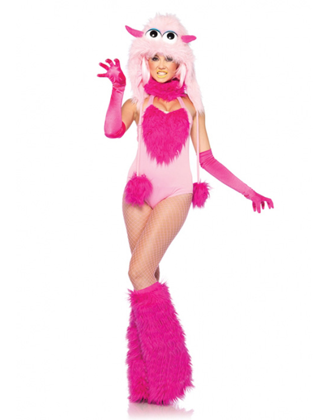 This sexy costume feature with a pair of pink glove and the cute fur piece with the eyes and horn. And the teddy style dress with dark pink and light pink detail and the pink leg warmer.