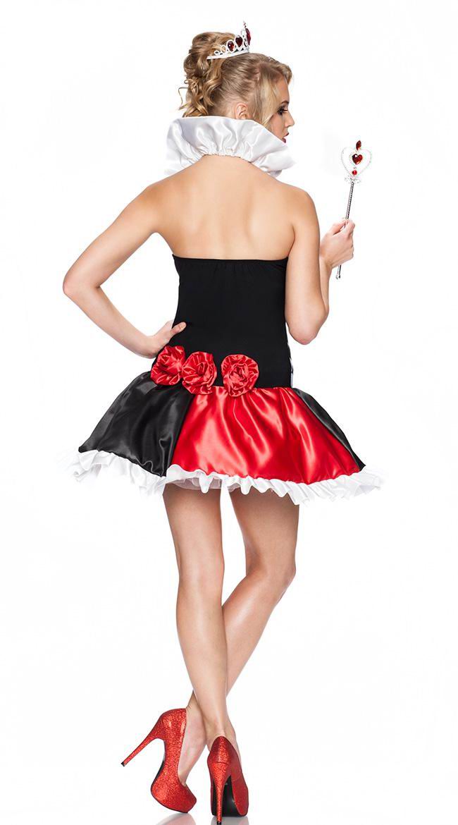 Officially licensed playboy queen of bunnies costume features a white ruffle strap halter top with low-cut neckline and attached classic white and black plain in half red and black hem mini skirt, both accented with hearts containing the famous bunny logo, tiara with red accent gems also included, perfect to store your costume year around.
