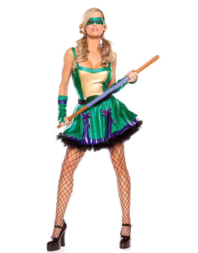 The Purple Ninja Turtle costume includes a metallic, stretch Lycra mini dress with thin shoulder straps, purple metallic trim details, turtle shell back, matching mask and metallic wrist gauntlets. (Fishnets, petticoat and weapon not included).