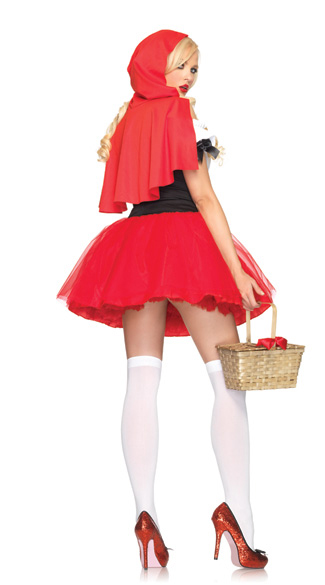 Wholesale Costumes.The Racy Red Riding Hood Costume features peasant dress with lpuff neckline trimmed,a black coat with lace ribbon trimming on front and a matching hooded cape.Basket and stockings not included.