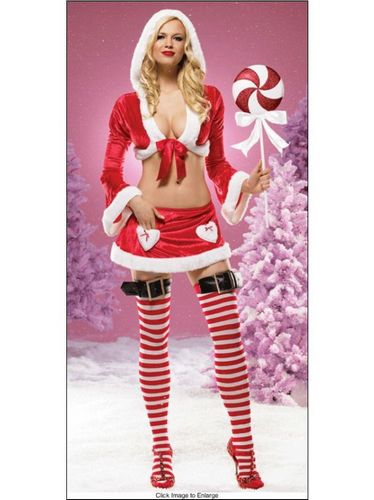 Red Candy Cane Christmas Cotume with long sleeve bra with bow on the front detail and the white fur trim hooded and the mini dress with double hearts pockets with the candy cane stocking with black design.