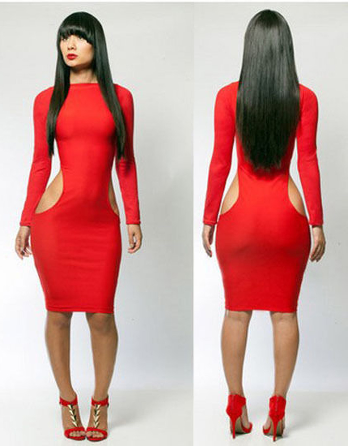 Red Long Sleeve S Shape Hollow Out Party Bodycon Dress