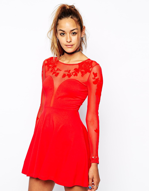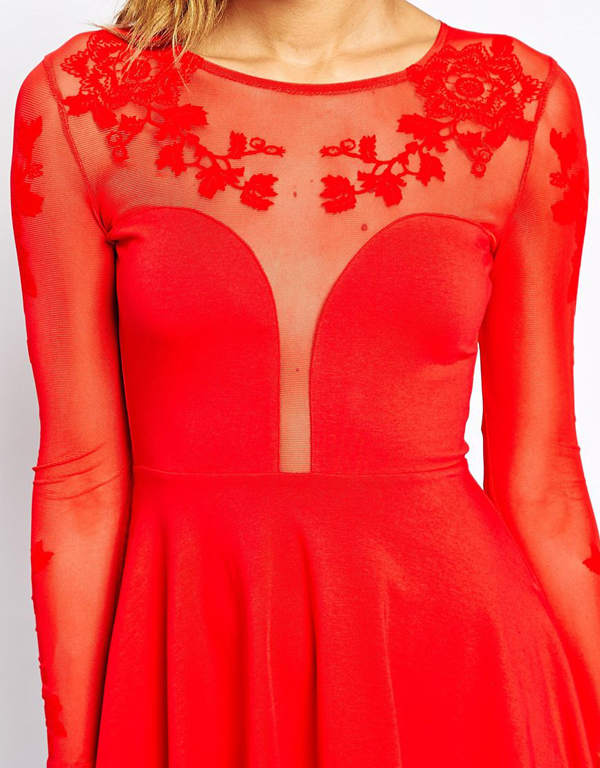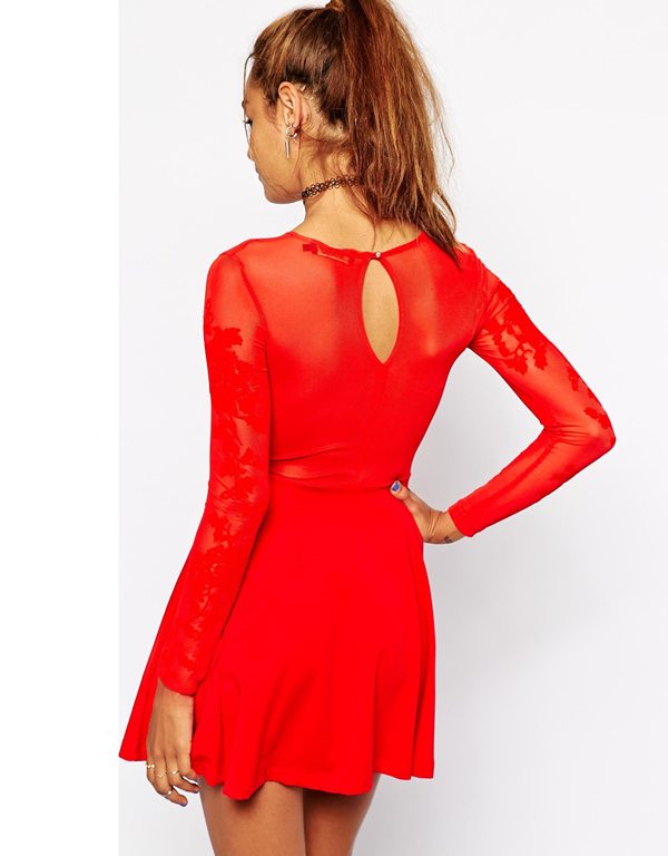 Red Long Sleeves Embroidered Mesh Plunge Hollow Out Back Skater Dress