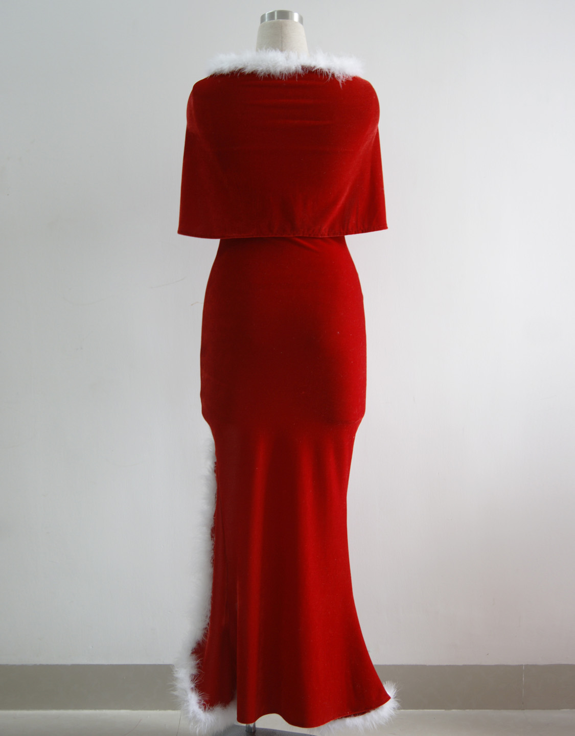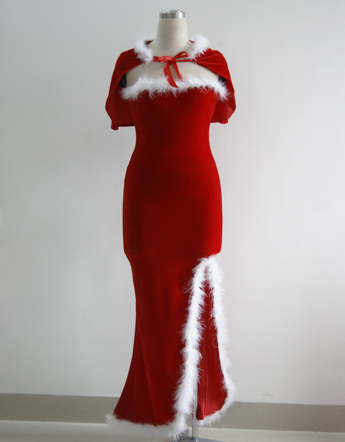 Stretch long dress with strapless and white faux fur trim. perfect to make it a sexy Holiday night or a special gift .