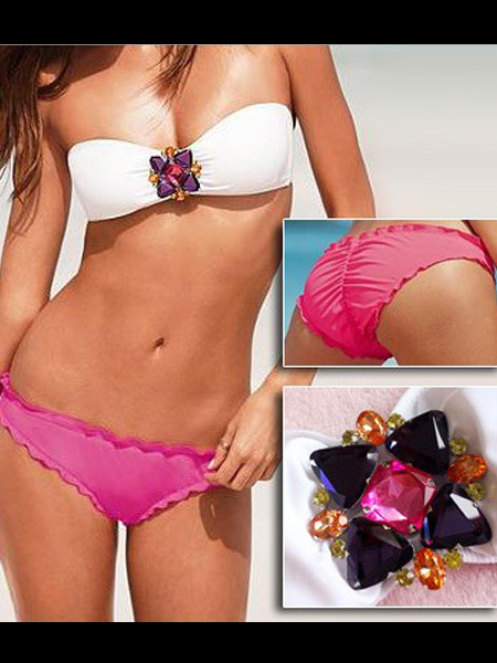 Red Rhinestones Strapless Bikini Set without classic shoulder straps. Show completely your shoulder. Cup with beautiful rhinestones in front