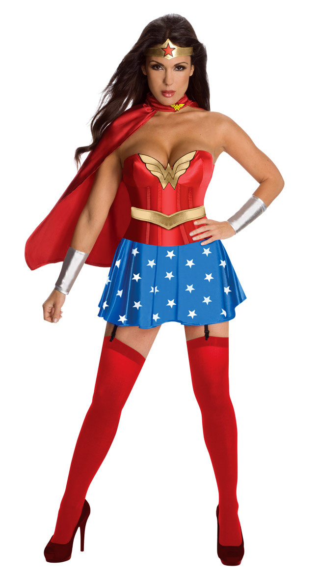 Wholesale Super Man Costume made in Wonder Beauty.The Red Wonder Woman Corset Costume is a seven piece set that includes a red satin corset top with gold bowknot front,and a gold belt,Attache a blue star skirt with drape trim detail,a red elegant cloak back, a gold heapeice and a matching silvery waist cuffs.Do not forget to match with a mini handbag and a pair of towering high heels will be more perfectmatch with a mini handbag and a pair of towering high heels will be more perfect.