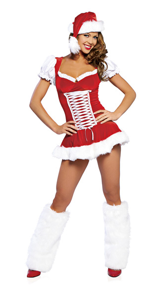 Santa's Candy Girl Costume.The Santas Darling Costume is a two piece set that feature a sexy red stretch dress knit with ribbon in front,tiered ruffle hem, mini puffs slevees and a snatas darling hat.Leg warmers not included.