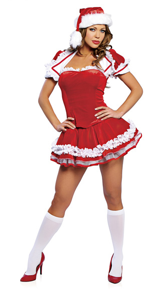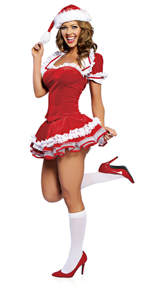Everyone wants to have the maid in christmas!The Santa's Maid Christmas Costume is a two piece set includes sexy red dress attached a printing petticoat with tiered ruffle hem,shoulder top lapel sleeve trimming detail and a matching santa's maid hat.Stockings not included.