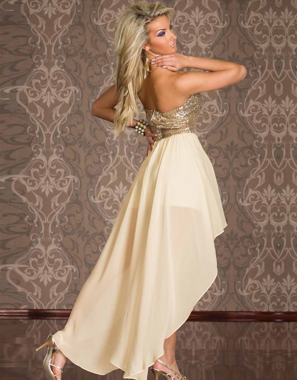 Hug your sexy curves and show the appealing appearance in this awesome Sequin Strapless Cocktail Dress Beige! Walk your steps and let the asymmetric skirt swinging in the wind, the sequined strapless top is oh-so-dazzling under the sun and lights. Invisible zipper on the side-easy in and easy out.