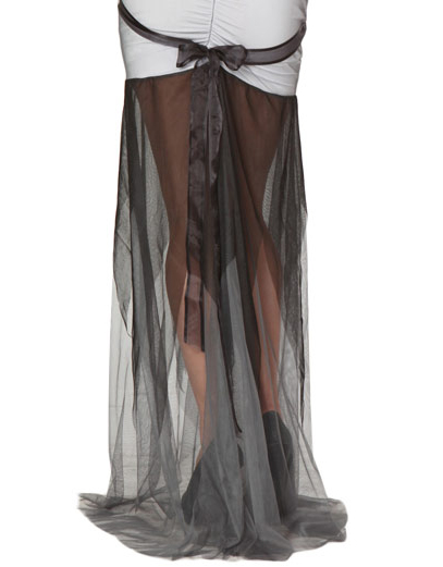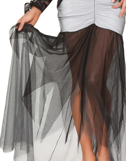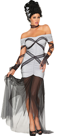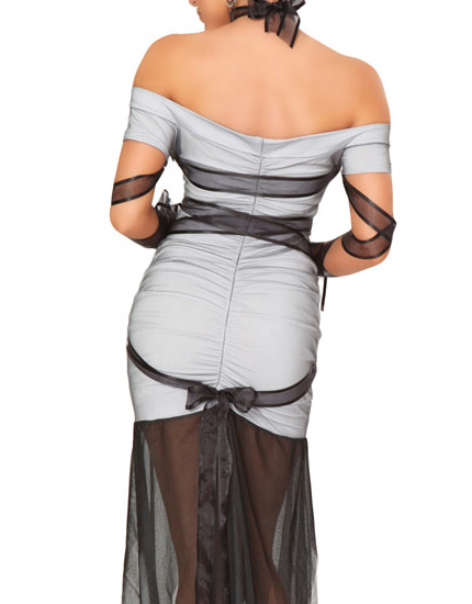 This halloween costume features pliacted tube mini dress joint black mesh. Unique sleeve design, off shoulder, black mesh band surround the dress and arms, tie up in the wrist and back.