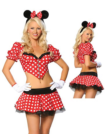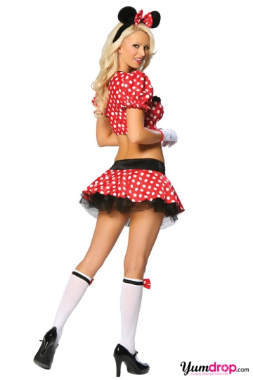 Wholesale Costumes.The three piece Sexy Mini Mouse Halloween Costume includes a skirt with white polka dot and black velvet neckline trim detail,zipper front top and Sexy Mini Mouse ears.Stockings, gloves and shoes not included.