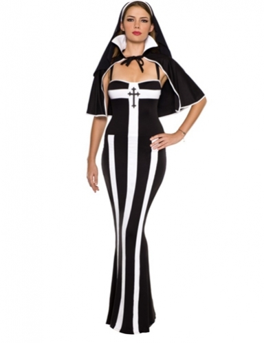 He might just forget about religion and worship you in this Sexy Nun Adult Womens Costume. The black; polyester dress of this sexy womens costume features a white cross on the front and the skirt with shoulder-straps with the stand collar cape.