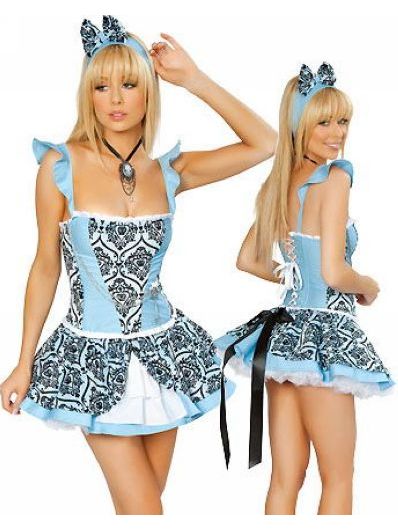 Wholesale Costumes.Limited edition for sale just at wonder-beauty!The Sexy Palace Alice Costume includes waist corset with flower front,boning and side zipper,Alice petticoat with wave trimming detail,a bow head band and Alice necklace. Stocking needs independent sales.