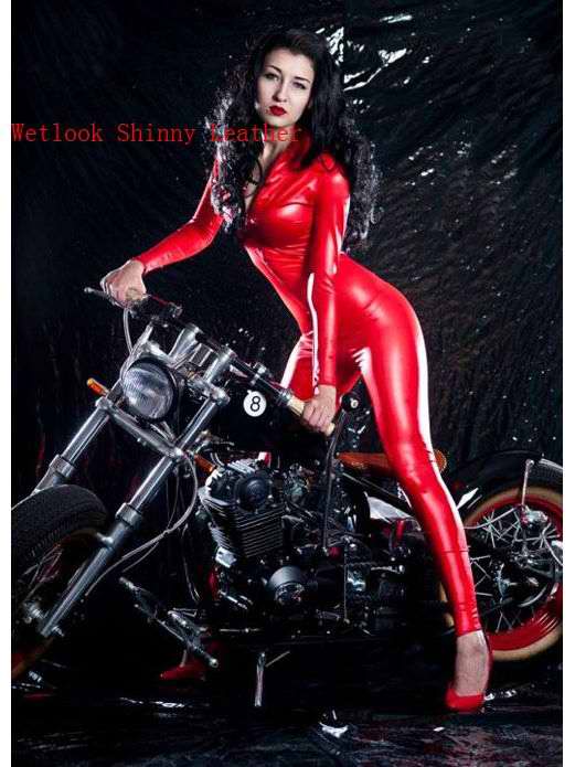 Sexy Red Long Sleeved Wet Look Cat Suit.Leather capri pants with front zipper opening. It also has a seductive front zipper opening.Wear a locomotive fan. From Allure Lingerie womens vinyl catsuits and pants Collection.
