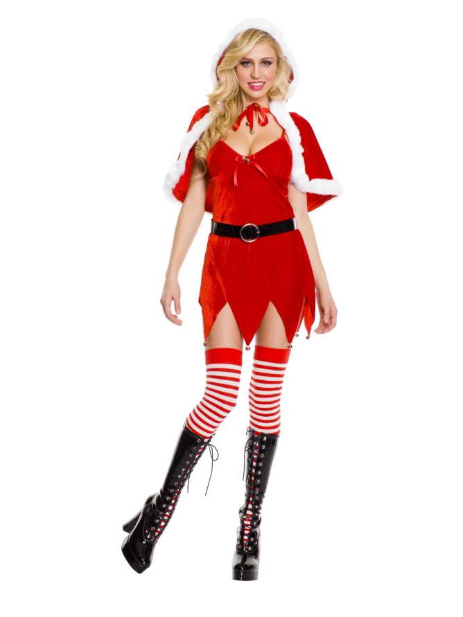 With the beautiful cape and with red ribbon tie arond the neck with jingle and the asymmetrical hemline also with the jingle detail and with the black belt on the waist.