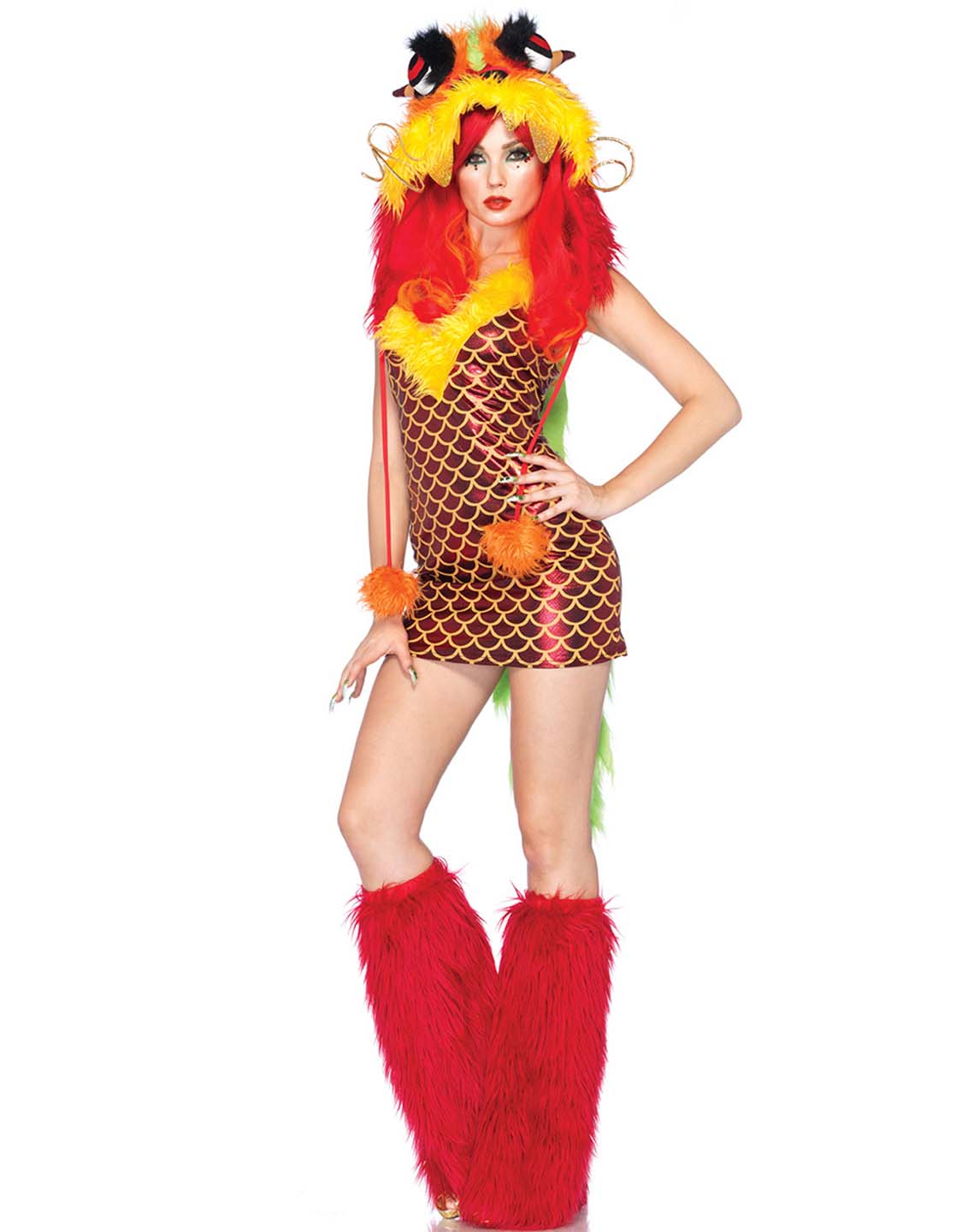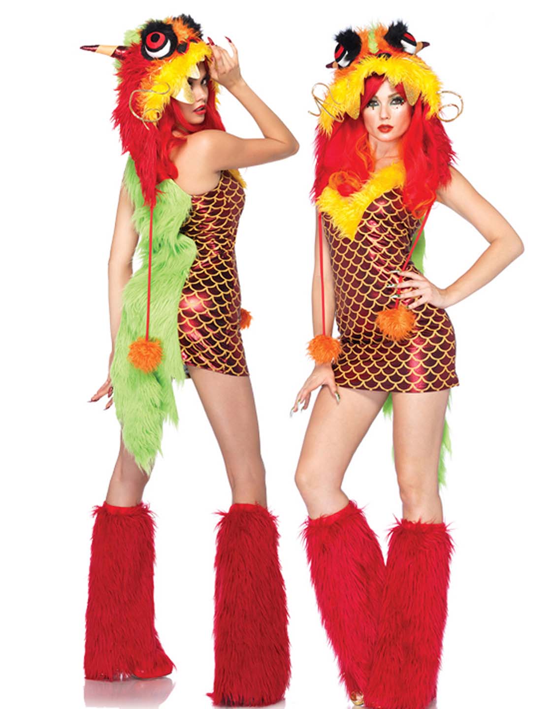 This Shiny Scale Fur Costume feature features a sexy shiny tank dress with yellow fur detail and attached green long tail. It also includes matching red leg warmers, hood with horns.