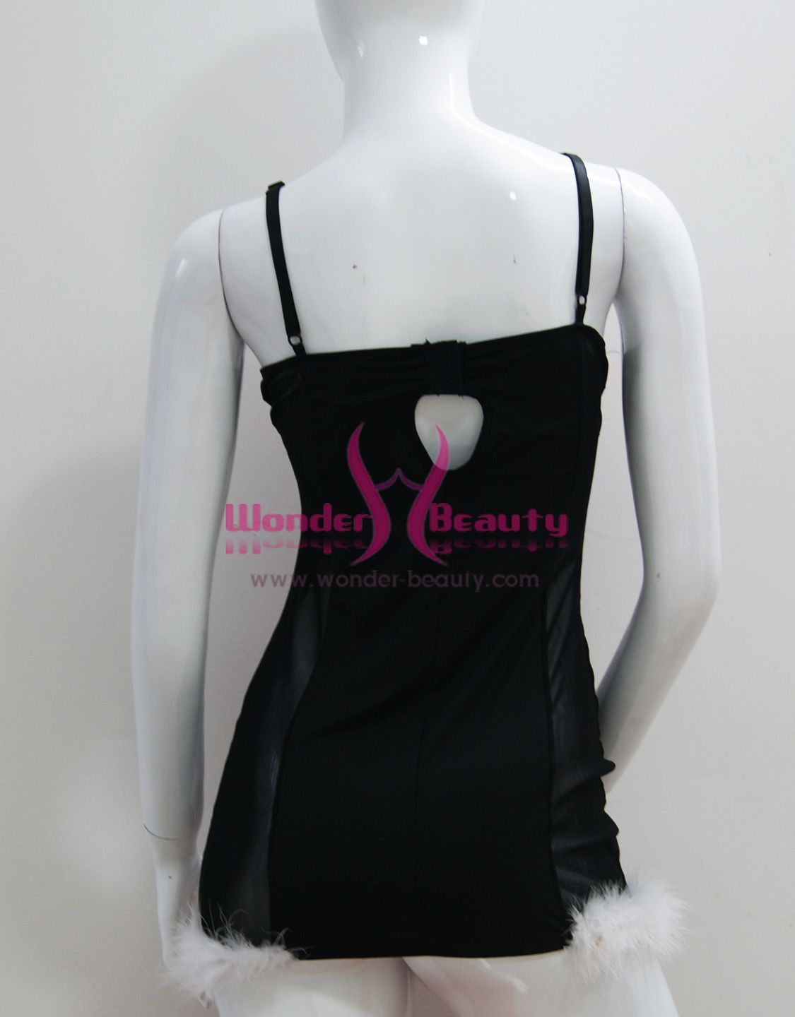 This mesh costume with the shiny sequin accent the cut and bowknot, white fur trim with adjustable strap.