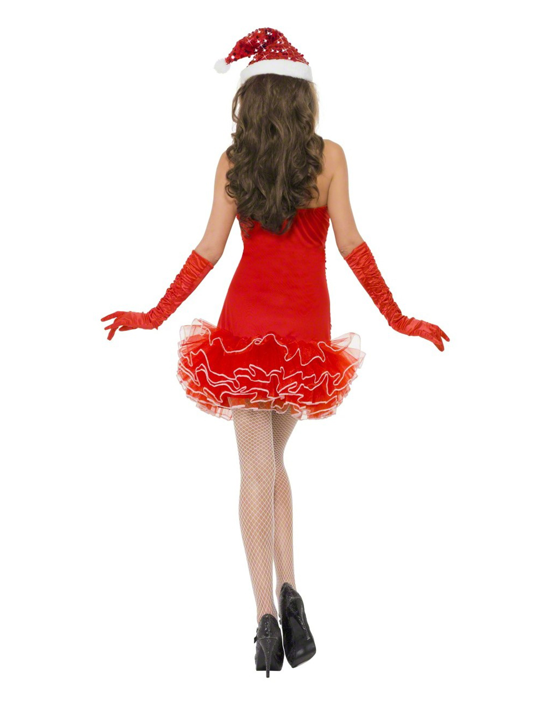 This strapless costume with the sweetheart neckline and white fur trim and the star detail and the white bow and multi-layered petticoat.